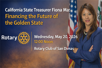 On May 20, 2026, at 12 noon, the Rotary Club of San Dimas will welcome California State Treasurer Fiona Ma for a timely and insightful presentation titled, California State Treasurer Fiona Ma: Financing the Future of the Golden State.